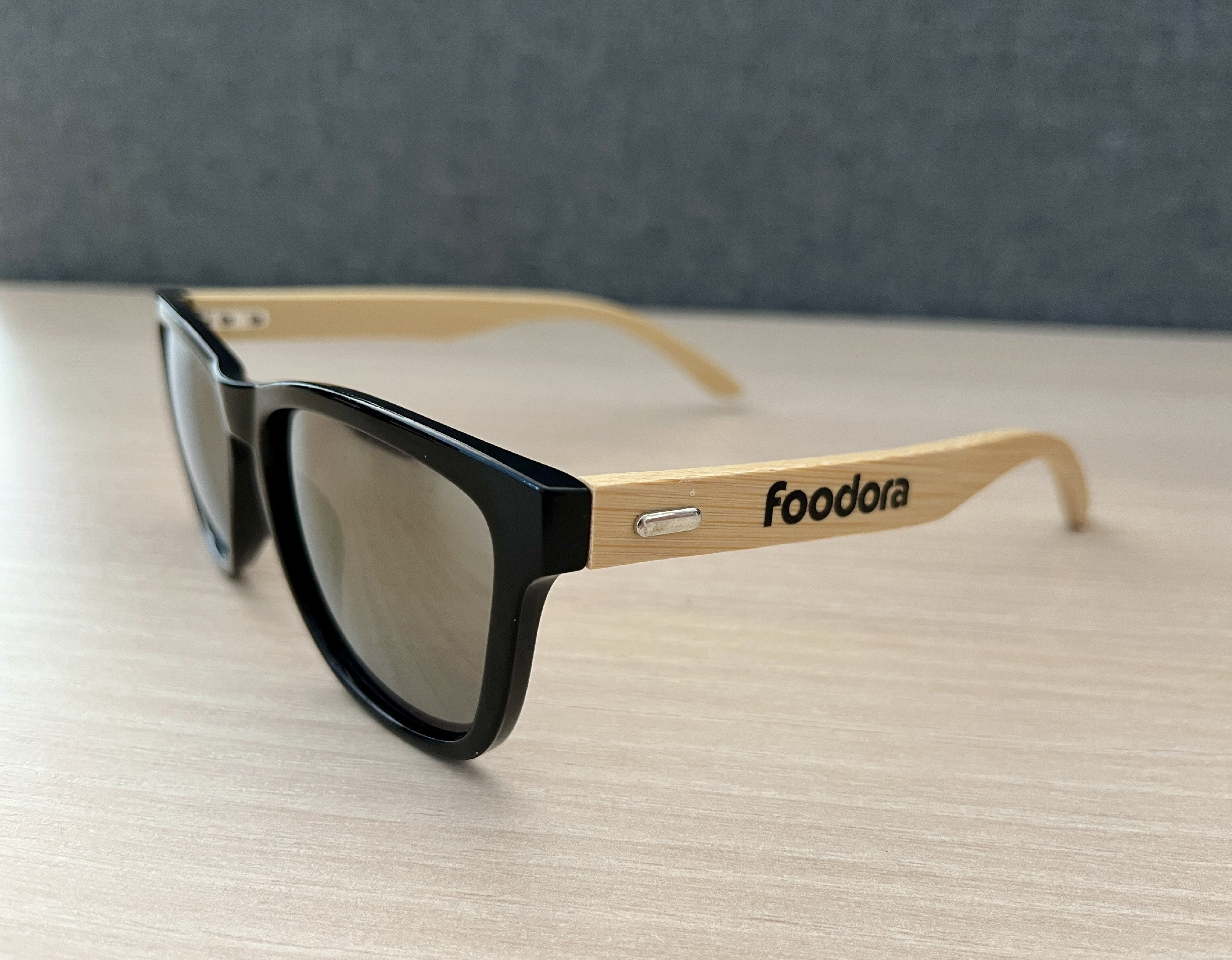 Stylové sluneční brýle s bambusovými obroučkami a logem foodora. Brýle mají barevné metalické čočky s ochranou UV 400.
